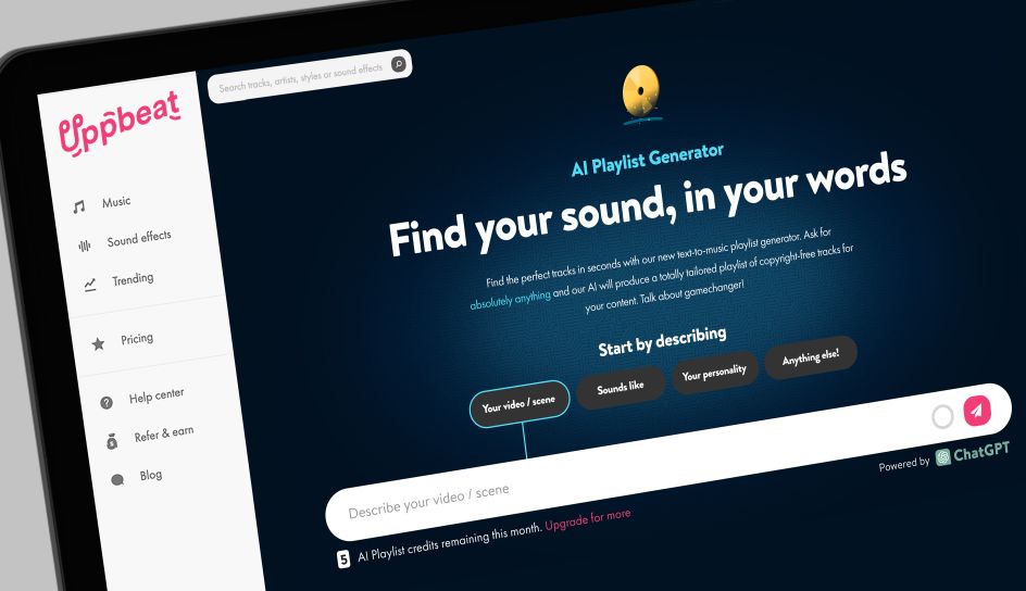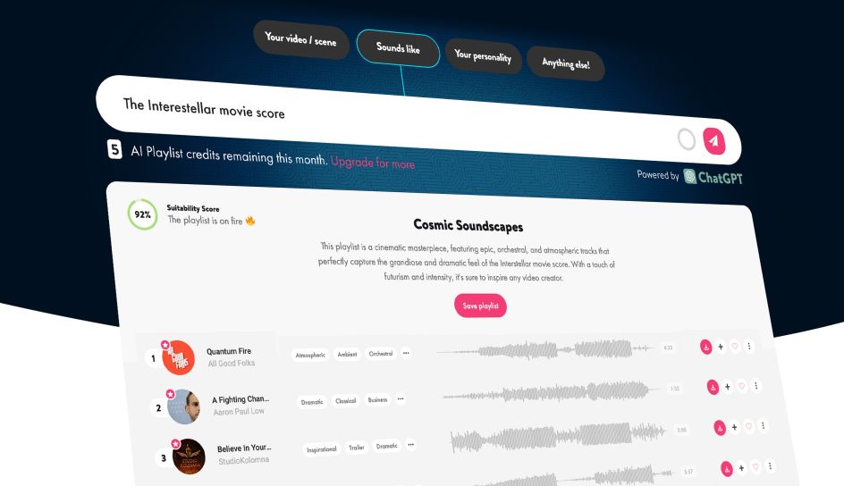 Uppbeat's range of super-cool features include the AI Playlist Generator, which crawls the catalogue to suggest the perfect artist-made tracks for your content. That means it functions like a lightning-fast music supervisor, potentially saving you hours of work.