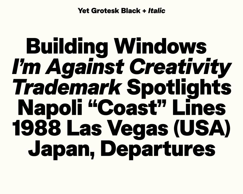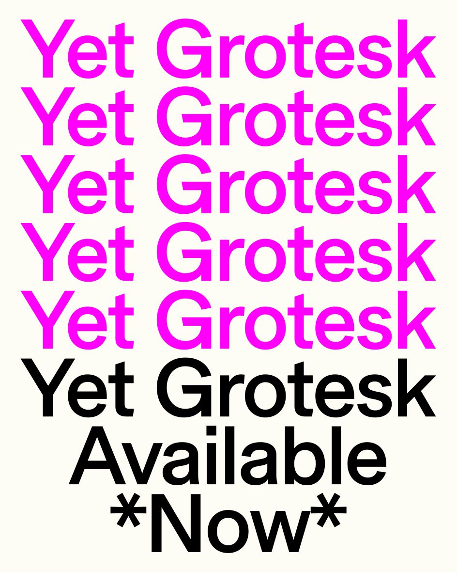 Inspired by legendary grotesks like Akzidenz Grotesk and contemporary forms like Arial, Yet Grotesk aims to be a versatile, functional typeface. Its wide capitals, tight spacing and robust text blocks make it ideal for branding and editorial design, proving that even the most common typographic form can be reinvented with care and insight.